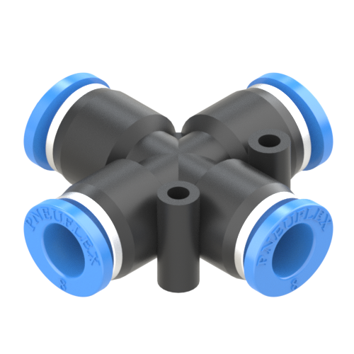 The PZ. – Push In Union Cross is an essential fitting for end-of-arm tooling systems, designed to provide secure and efficient connections for pneumatic tubing. This cross-shaped union allows for efficient distribution of air flow in multiple directions, making it ideal for various automation and robotic applications.
