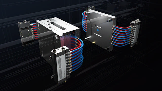 Showcasing the seamless connection of 4 manifolds to a mould's halves. This compact design allows placement close to the mould, minimizing hose length for reduced pressure and heat loss.